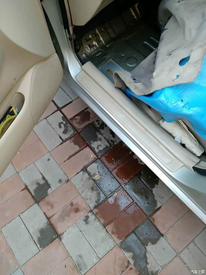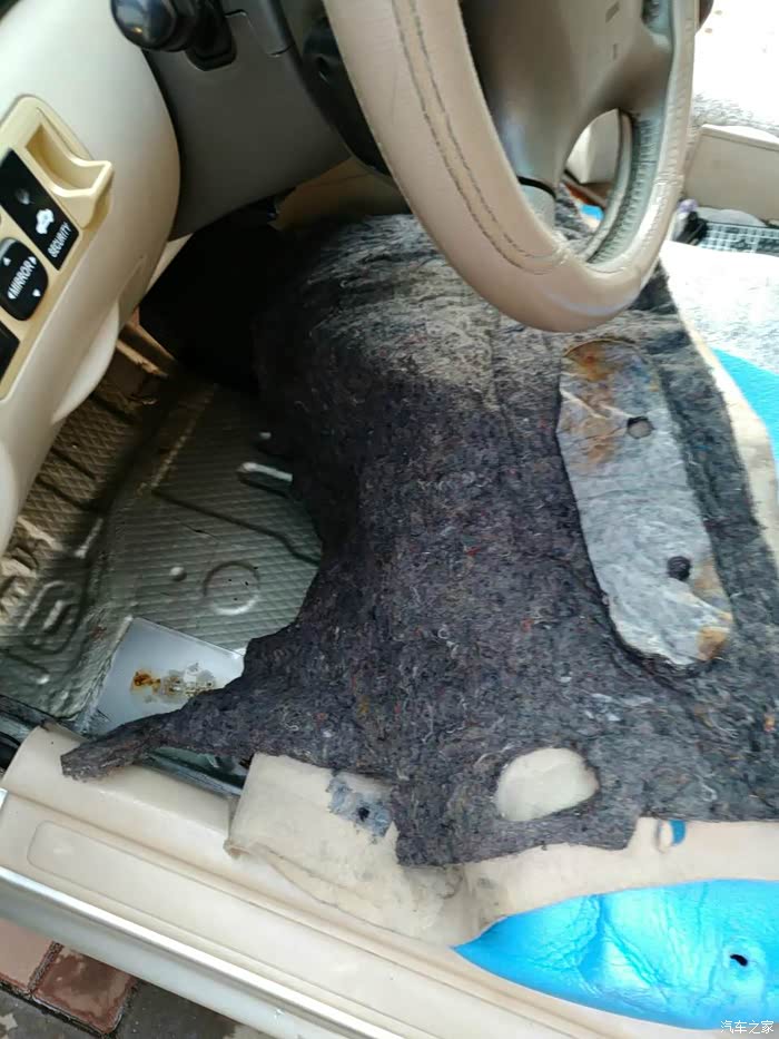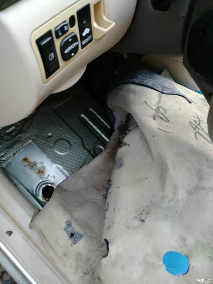 用手摸了一下刚换的胶管,没有再漏水,本以为完事了,谁知又有新情况了!用手伸进地胶底下,我的天呀!全是水,而且都汪汪着,拆吧!我说以前加的防冻液都哪去了呢?原来都流到主驾的地胶低下了!发现了隔音用的黑心棉!滴滴答答的在滴水!钢板都腐蚀起锈了!