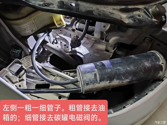 东风风神S30时间久了碳罐总成以及碳罐上的管子都会老化开裂。我网上买了一根管子自己动手换。上次碳罐电磁阀通向碳罐总成的管子开裂了,在修理厂修了。这次突然无意发现碳罐总成通向油箱方向在右前轮拐弯的位置管子开裂了。自己动手换好了。