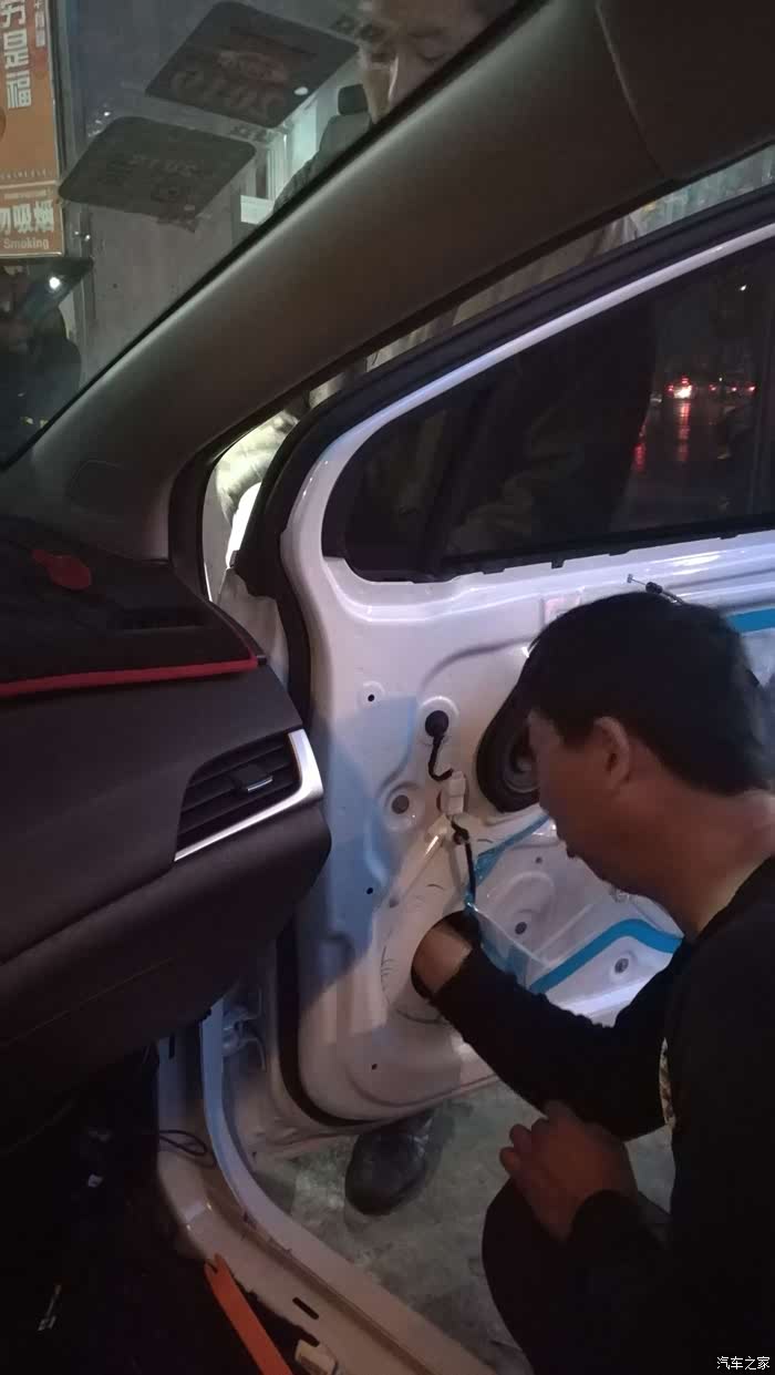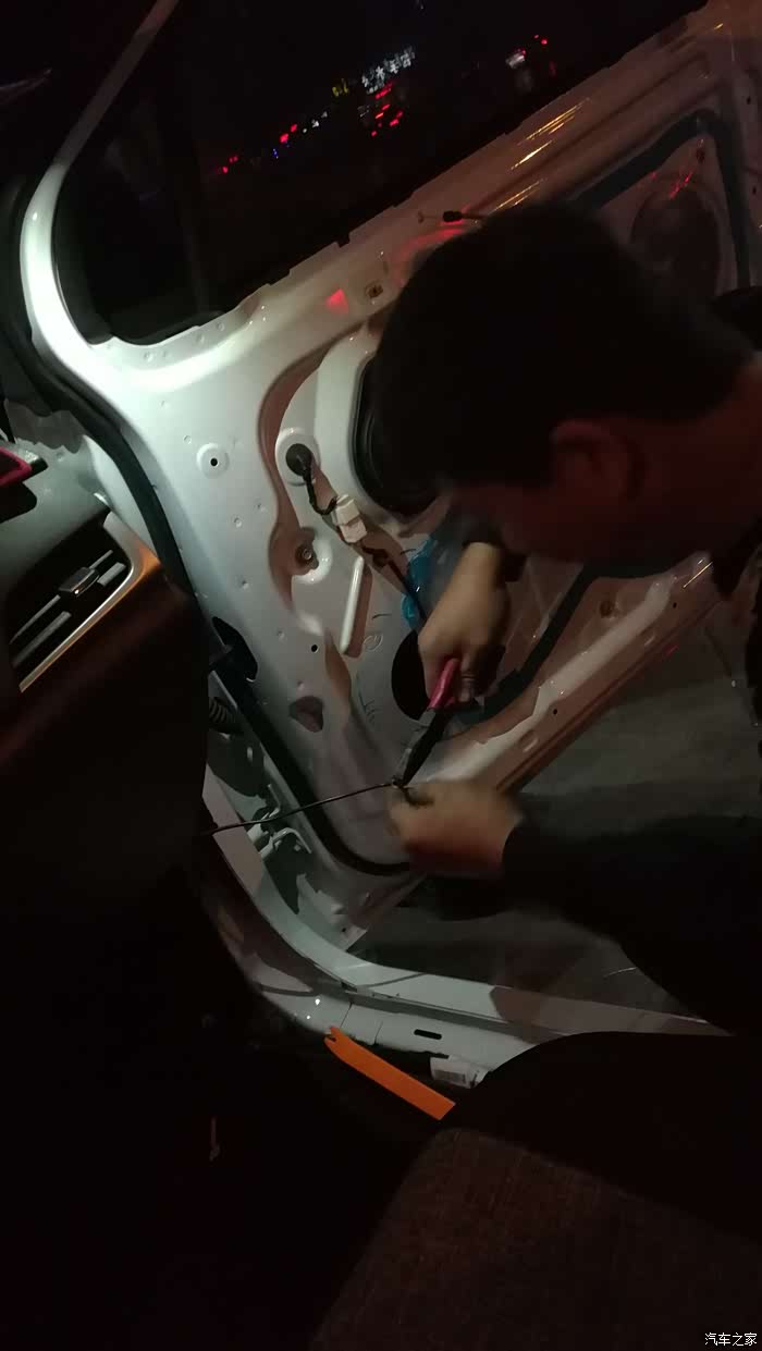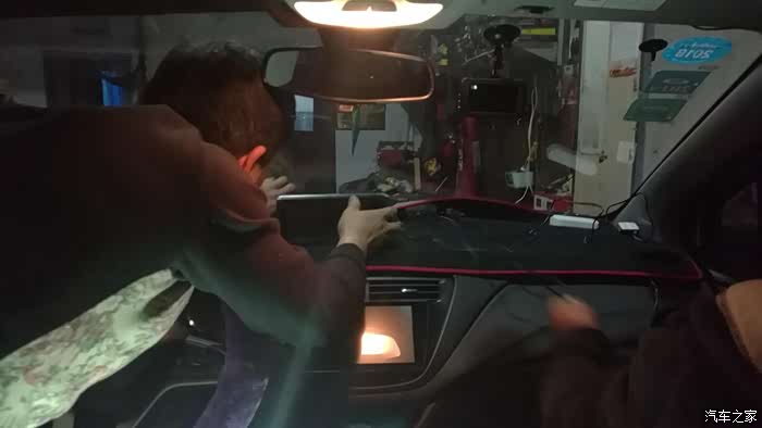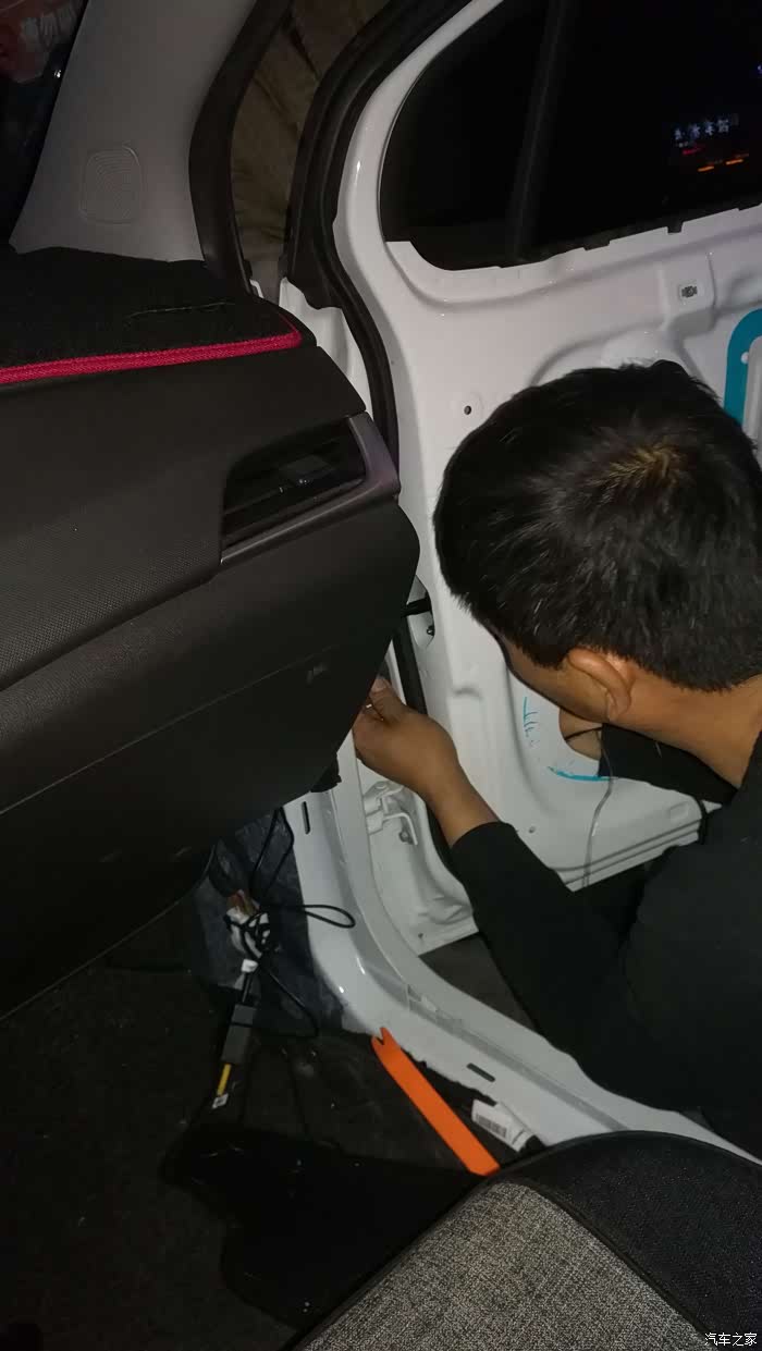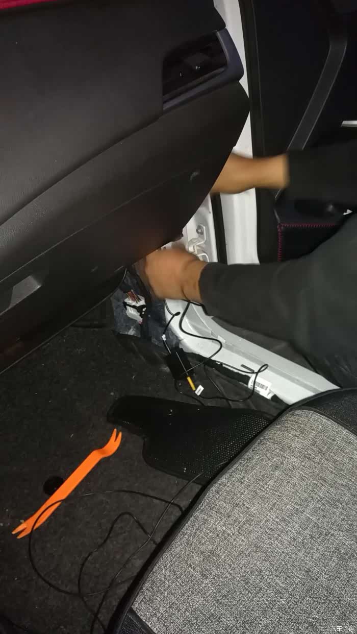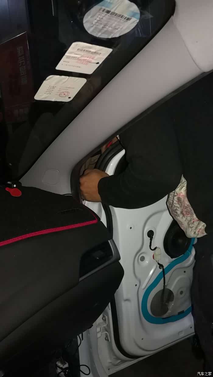 本来说明上说的可以直接粘到后视镜下面,从车门上面引出去,可二位师傅敬业啊,将线从车门中走。