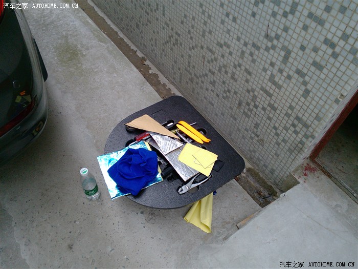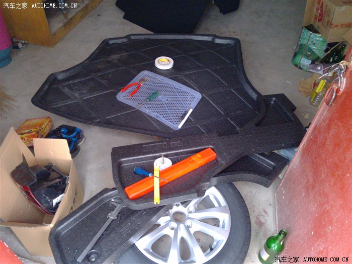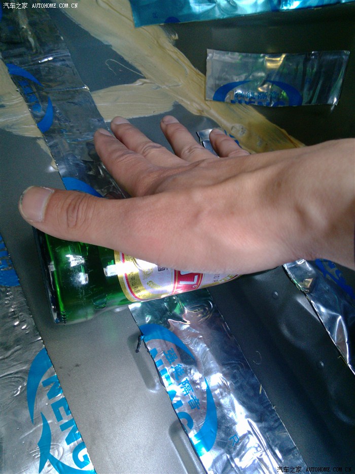 贴好以后就要用力把止震垫压紧压实。。这样隔音想过才好,,我没有购买手轮,为什么?节约钱呗。。。我有秘密道具,啤酒瓶。。使起来相对顺手,个别凹凸的地方我就用螺丝刀的手柄来回滚动挤压。。这个真的是体力活。。。有点累,我181的身高蹲在后备箱,我压啊压,,压的腰真酸。。