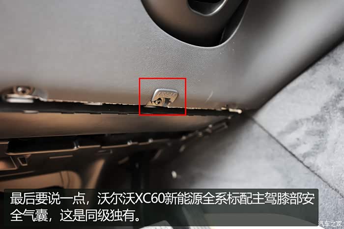 在车辆发生正面碰撞时,由于膝部距离中控台的位置最近,是最易发生骨折损伤的部位,甚至留下后遗症。沃尔沃XC60新能源全系标配了主驾膝部安全气囊,可以有效防止在碰撞中膝部、腿部的伤害。