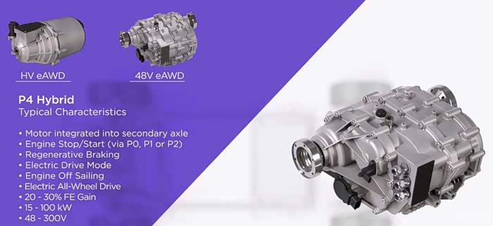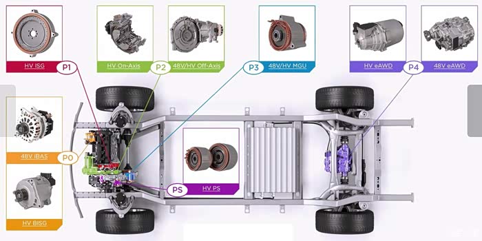简单点说,P0是电机在发动机曲轴皮带轮端,取代启动机位置,通过皮带传动;P1是电机在发动机曲轴输出端,转子和曲轴硬连接,取代飞轮位置;P2是电机在变速器输入端,取代液力变矩器位置,通过离合器给变速器输出动力;P3是电机在变速器输出端,连接前桥减速器,通过差速器后直接给半轴输出动力;P4是电机在后桥中间,连接后减速器、差速器、半轴,给后轮提供动力。