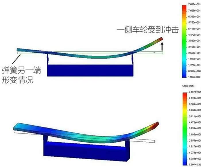 从这张技术图中,我们可以看到沃尔沃XC60叶片弹簧一侧受到冲击力的时候,另一侧几乎是没有太多抖动,反而表现的非常从容。
