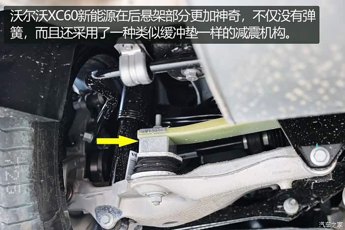 沃尔沃XC60新能源在后悬架部分更加神奇,不仅没有弹簧,而且还采用了一种类似缓冲垫一样的减震机构,官方称其为“复合材料叶片弹簧”。由于沃尔沃XC60新能源需要将电机安置在后轴,为了不霸占车辆的载物空间和乘坐空间,原厂工程师才会选择采用更省空间的复合材料叶片弹簧,这也是专门为沃尔沃的SPA平台参照传统多连杆悬架研发而来的。