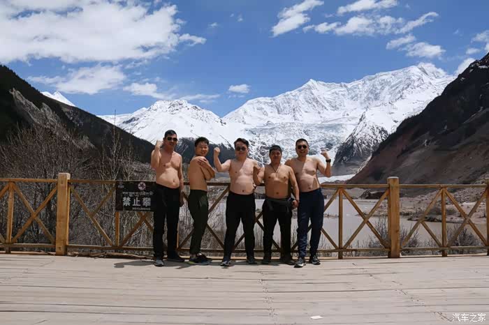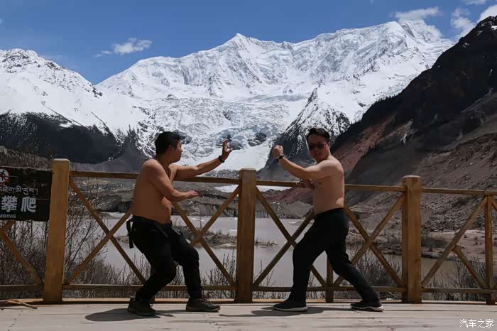 午饭后抵达米堆冰川,昼夜温差大,紫外线也比较强,在雪山面前光膀子留念