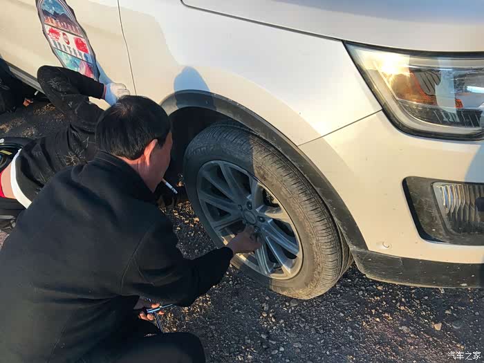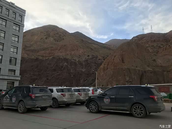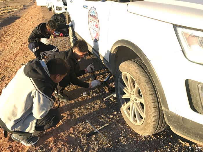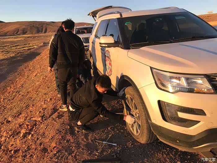 真是太早了,要经过可可西里无人区,领队说之前走每次都堵车,要开车到10点,所以我们就只能早走,避免开夜路,结果我们下午8点30分就到达了酒店,运气非常好,没有遇到堵车,但一早出发遇到了一点小事故,其中一辆车为了躲避被对向占道行驶货车,压马路边缘爆胎,双向车道都比较窄,没有停车的地方,车队只能停在马路陡坡边缘,摆好警示牌,还好我们有4s店随行的维修技师跟着,迅速与车友配合换下了备胎,车友们一路前后保驾护航前往附近安多县城换胎。