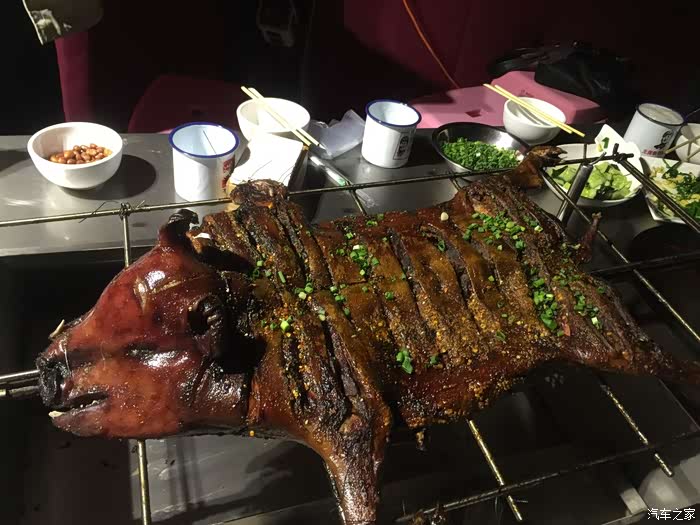 今天在酒店开荤吃大餐,烤了一头猪、一只羊、一只鸡,味道很好。老板很热情。