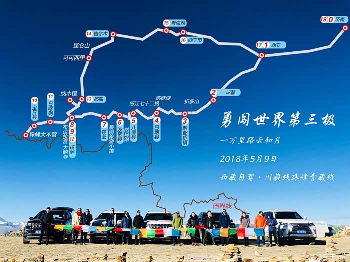 首先,我们为期18天的旅程 一行6辆车,共计19人,其中有4辆探险者,行程是骋行天下车友会里组织的。找的专业的四川花途印象领队2人,随行的还有顺骋4S店安排的专业维修技师1人,保驾护航。
