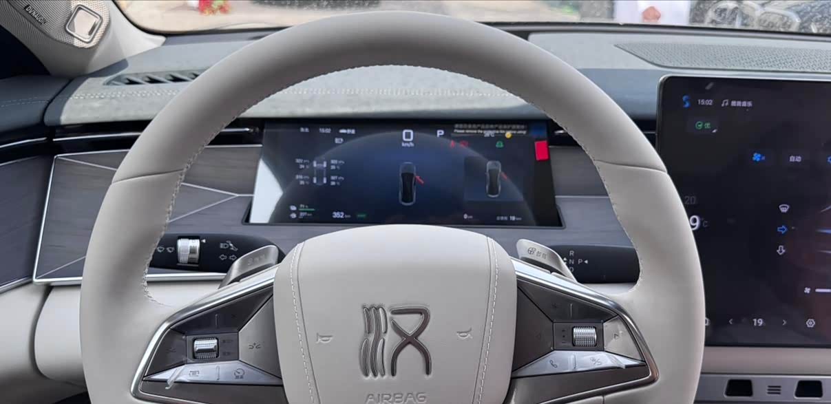 握持手感和造型设计和内饰风格更协调。方向盘中央的“汉”字logo比初代的蓝底树脂材质的要显档次的多。