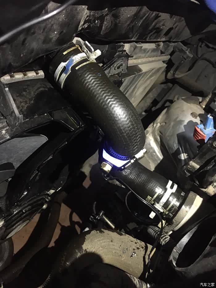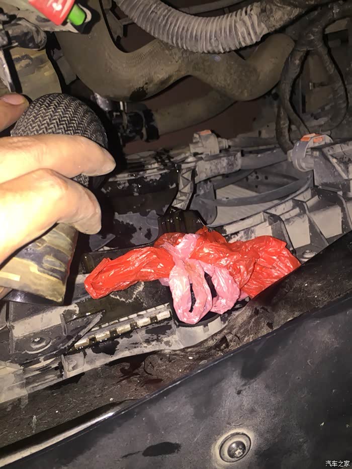 取上水管,水箱的这头,准备好两三个塑料袋,管子取下,直接用熟料带塞住水箱口,其实漏也漏不了多少,只是我没有备用的防冻液而已