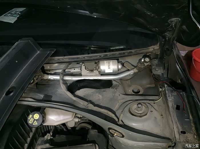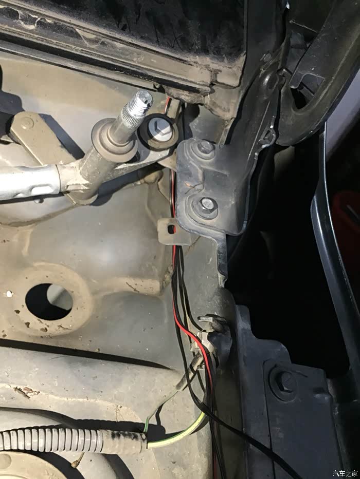 把穿出来的线绕过雨刮器联动摆臂。这里说一下,其实一共是四条线,红正黑负,还有两条很长的是接水温感应塞的,有插口直接对接就行。只是忘了拍照了