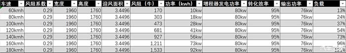 严谨地说,这套测算变量很大,首先风阻系数套用的是同级别SUV蔚来的0.29cd,增程器发电功率套用卡罗拉1.2T的,发电转换效率参照的是主流水准,忽略了滚动阻力。