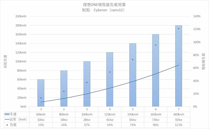 主流发电机的发电效率还是挺高的,能到95%,因此发电效率再打个95折,因此最大发电功率为76kw,以120巡航的话,增程器负载为54%,其他车速工况的数据如下表