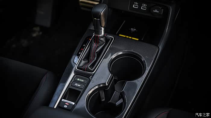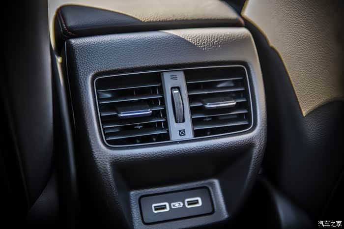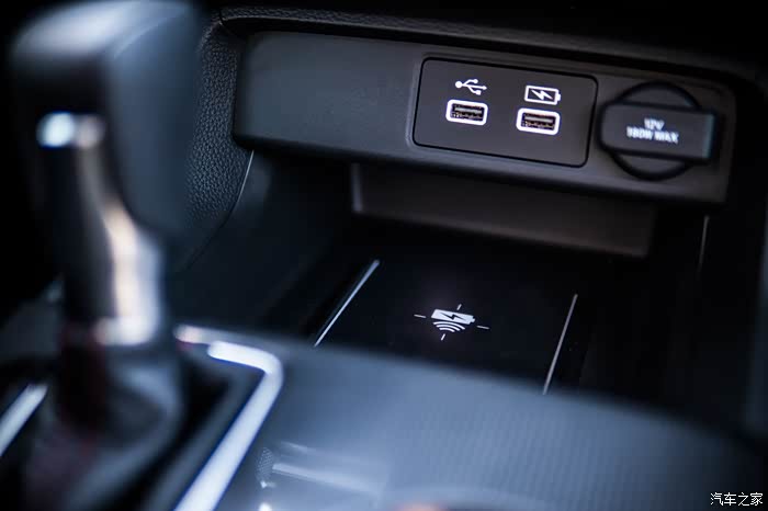 中控台使用了仿碳纤维的塑料件,看着还是不错的。前排有两个USB接口,下面还有无线充电功能,以后出门也不用担心忘带数据线了,省去不必要的麻烦。