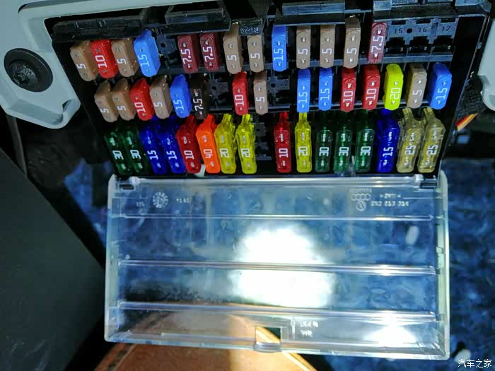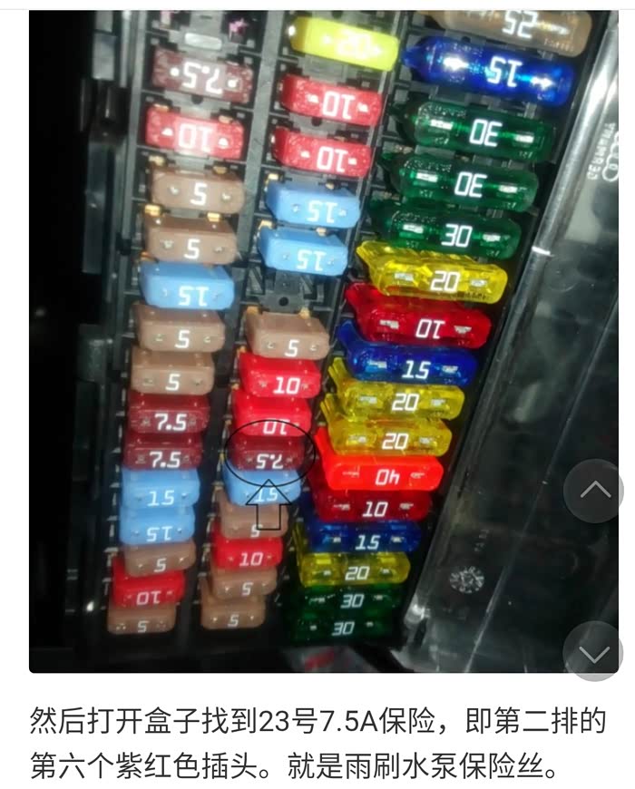 保险盒里面观。中间一排,从左面数第六个就是玻璃水泵的保险丝。找个镊子夹住往下拉就行,不要怕弄坏,反正要丢掉的,大力出奇迹。