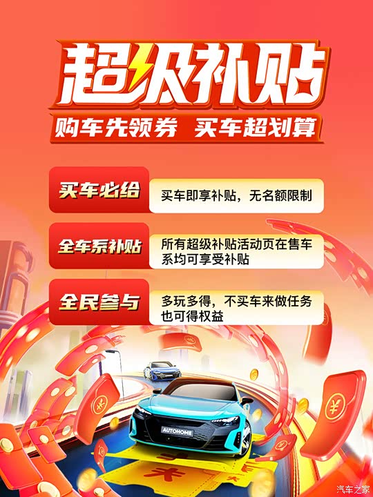 汽车之家全新推出【超级补贴】活动,各大热门车系均有补贴!买车先领券,再去4S店购车,购车后线上核销就可以拿到之家给的购车补贴,实实在在可提现的高额补贴哦!不买车做任务,也有商城购物券可得,积分排名还可冲iPhone14 pro!无门槛参与哦!