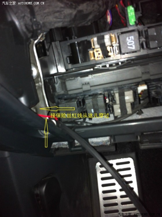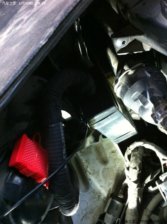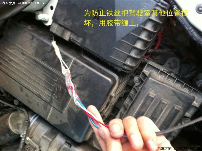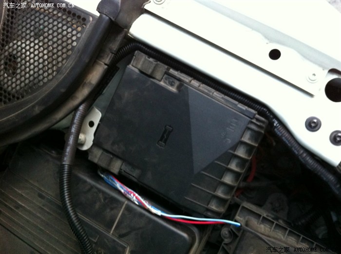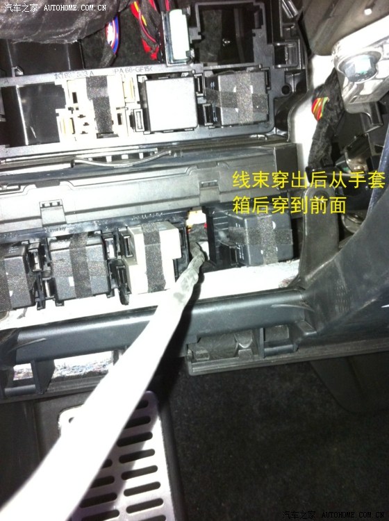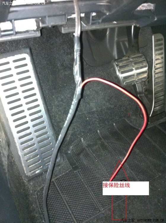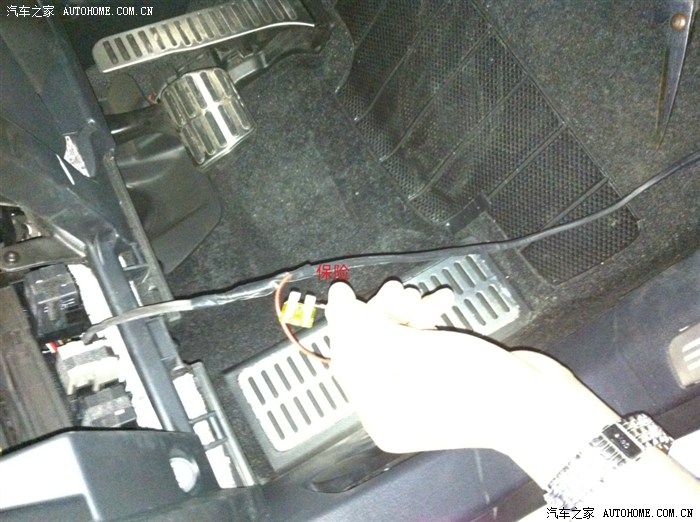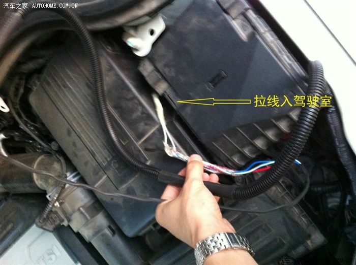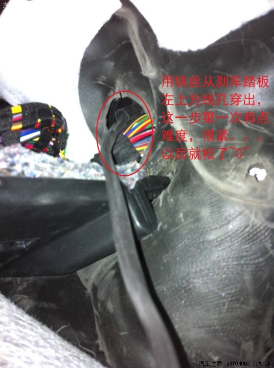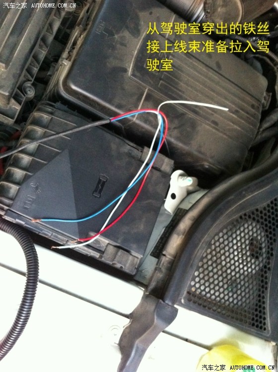 从驾驶室刹车踏板左上方的孔穿铁丝进去,铁丝会从电瓶和行车电脑中间缝隙出来,这一步忘记拍相片了……