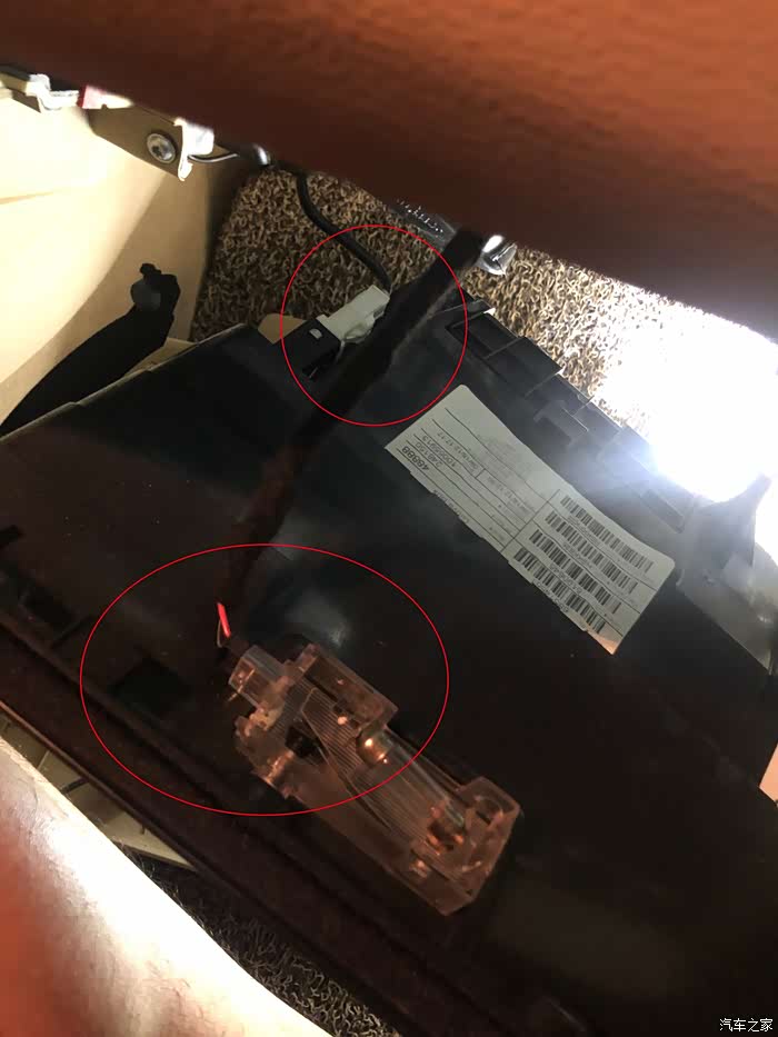 将两边转轴附近的黑六角型螺丝拧下来后,就可以非常轻松的抽出手套箱了。 手套箱正常有两条电线连着,小心将连接处拔掉即可。白色的那个需要按住中间的卡扣慢慢拔下。
