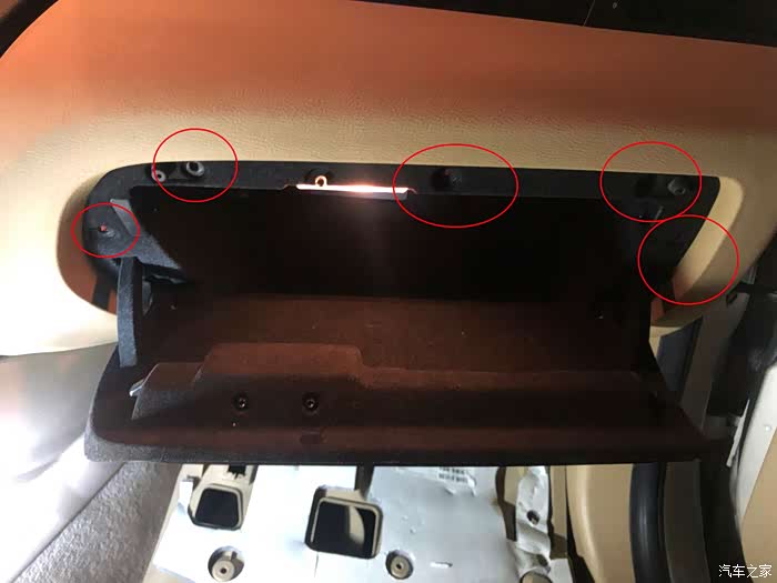 首先,打开手套箱,有5颗六角形螺丝,需转下来。