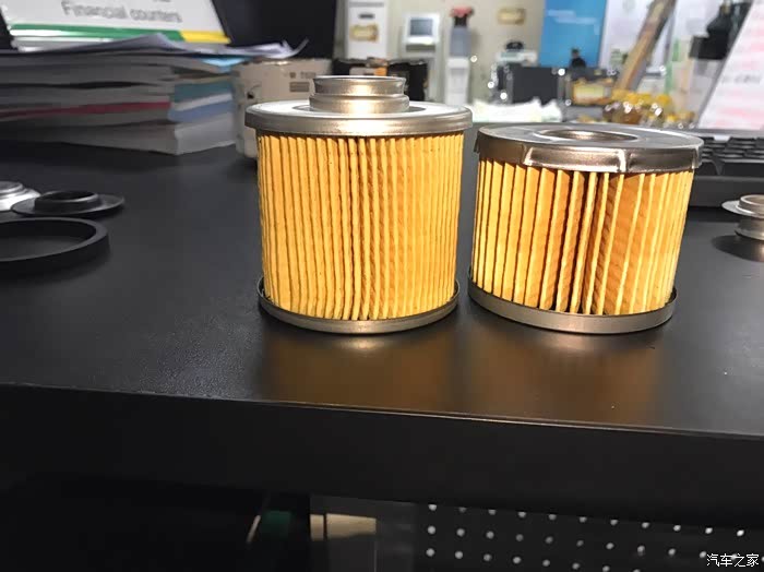 对比图,高的是曼,滤纸是不是要比WIX密很多,颜色也正。滤纸接口曼用的是铁片夹住密封,WIX用的是胶沾,曼更结实些。