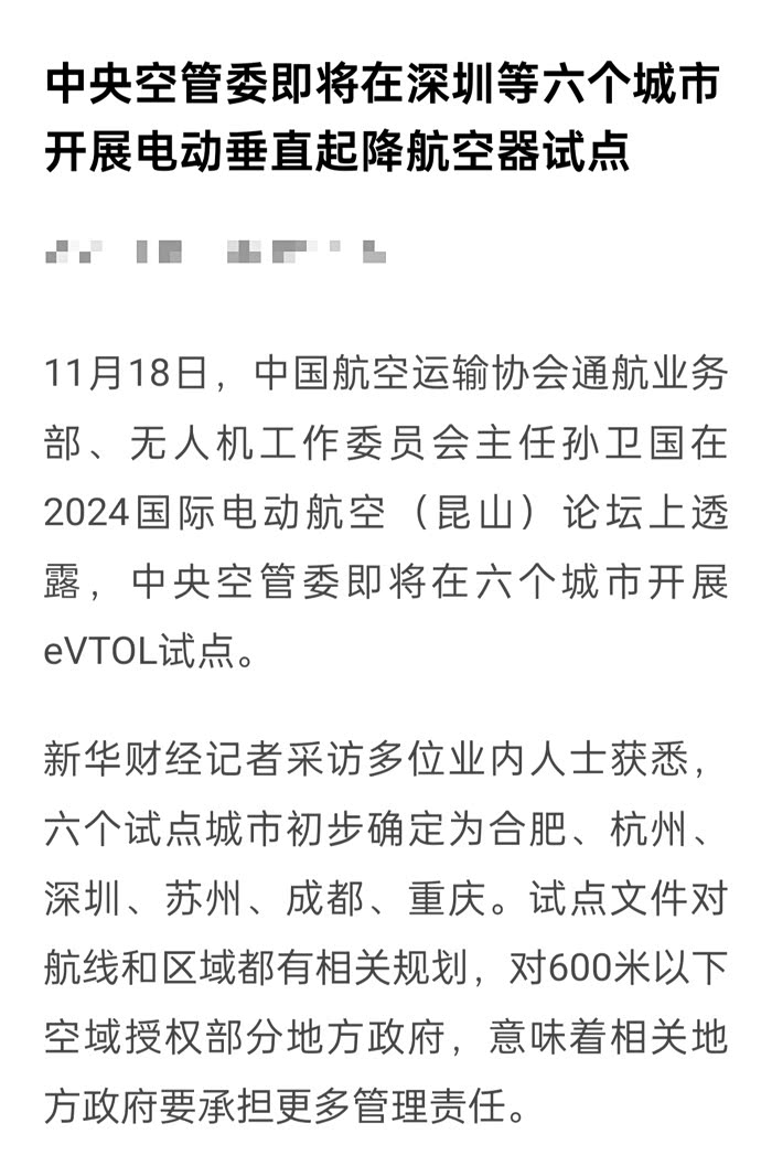 据中央空管委2024年11月消息称,将在合肥、杭州、深圳、苏州、成都、重庆六个城市开展电动垂直起降航空器(eVTOL)试点,这意味着打“飞的”出行真的有可能实现,但要普及全国各地至少得10年吧!