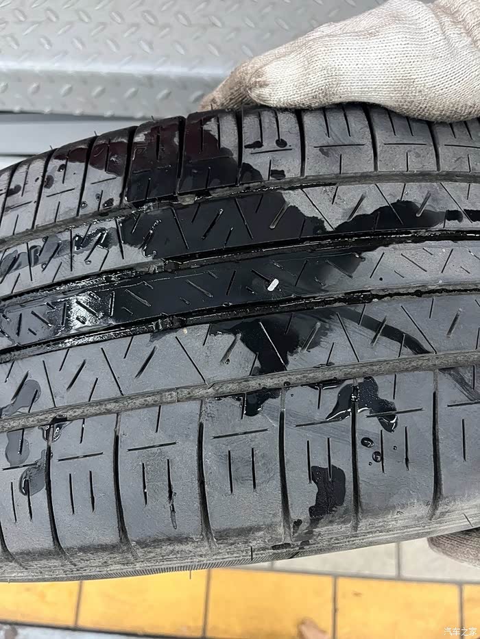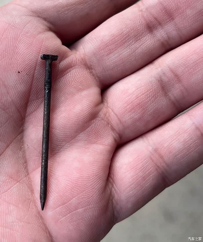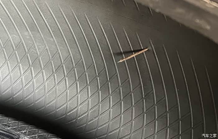 无意间发现轮胎扎了个钉子..........胎压没有报警,说明还没怎么漏气