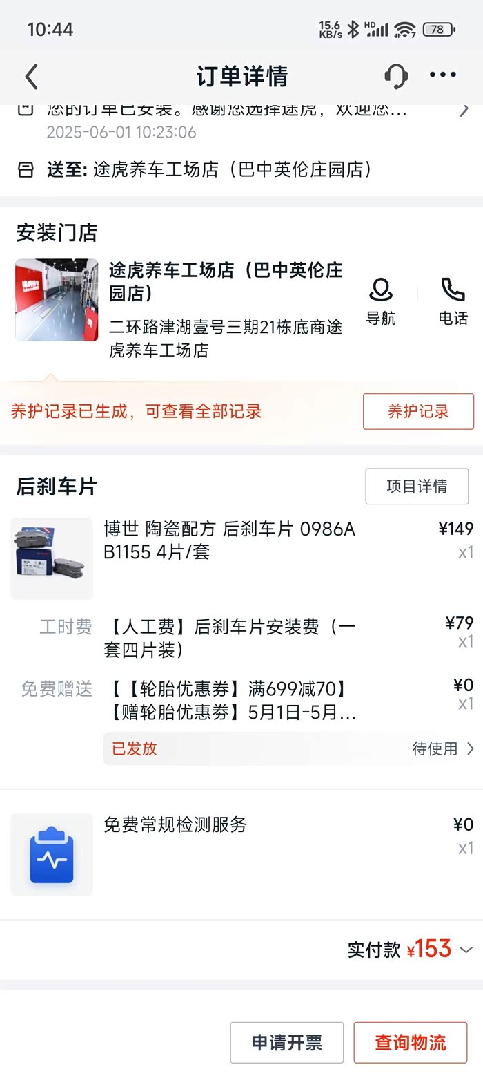 前两天轮胎扎钉子了,想起原来在途虎养车APP上面免费领取了补胎券,随即去途虎养车免费补胎。师傅检查的时候,告诉我后刹车片可以更换了,已经要到警戒线了,我回想了下,还是6万公里换的,是时候要换了,问了下师傅前刹车片怎么样,师傅说还能跑一段时间,当天我就下单了博世的后刹车片,价格还是挺便宜的,第二天就到了,今天抽空去更换了 。师傅说博士刹车片要响,我开了一段路感觉没响,不知道是不是要急刹才会响。更换下来的刹车片你们看是否到了警戒线需要更换呢?