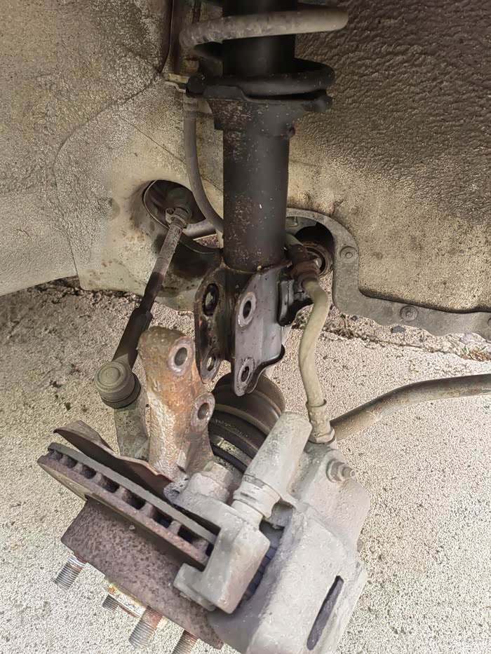 前段时间撞到个减速带,右前减震坏了,买了两个前减震总成,在清明准备更换。看起来就四个螺丝,但是下面两个大螺栓特别紧,前后花了5个小时