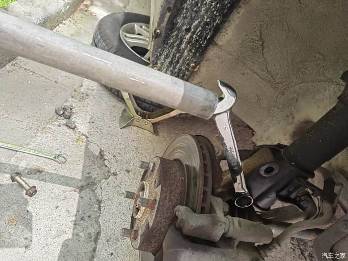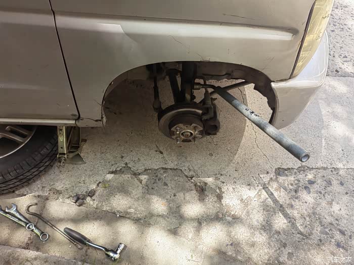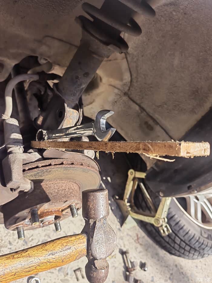 左前下方螺母很紧,只能垫木头敲击