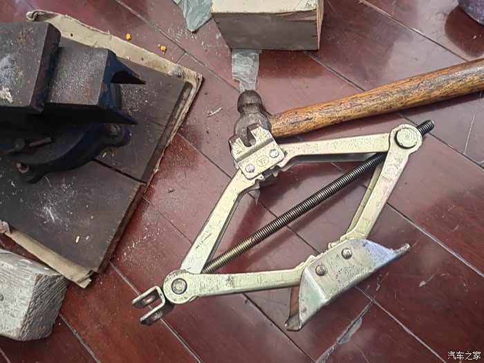 首先修复了随车千斤顶,主要原来随车千斤顶啮合齿轮有点错位(不对齐),有崩裂风险,想着后面半路换备胎需要,就花了两个小时把铆钉锯短后重新铆好后,啮合齿轮对齐了。