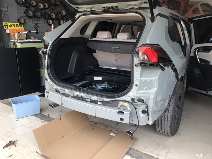 先拆后杠,一拆开后杠就看到了之前安装的前四后四倒车雷达。不是原厂的,但也能在仪表盘显示。