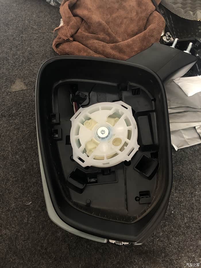 拆下后视镜,原车的镜片没有盲点提示灯,要更换带有盲点提示灯的镜片。