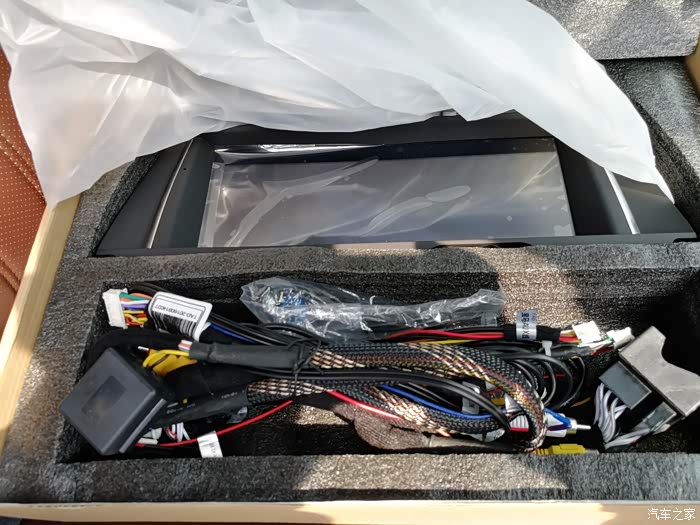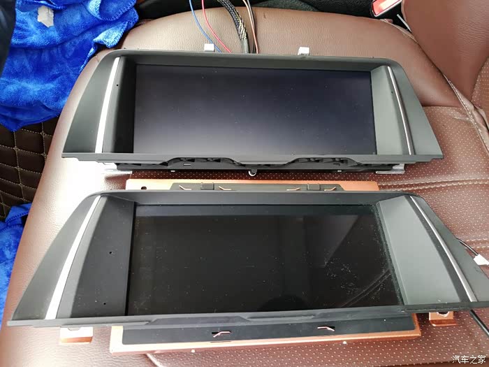 上面的是这次要装上去的安卓大屏(长一点,矮一点),下面是之前装的雅音安卓(短一点,高一点)。两块屏的面积差不多,但是要装上去的这块大屏的屏幕采用的是进口的黑洞屏,据说和原车的NBT屏幕差不多,防反光效果确实比雅音大屏要好很多。