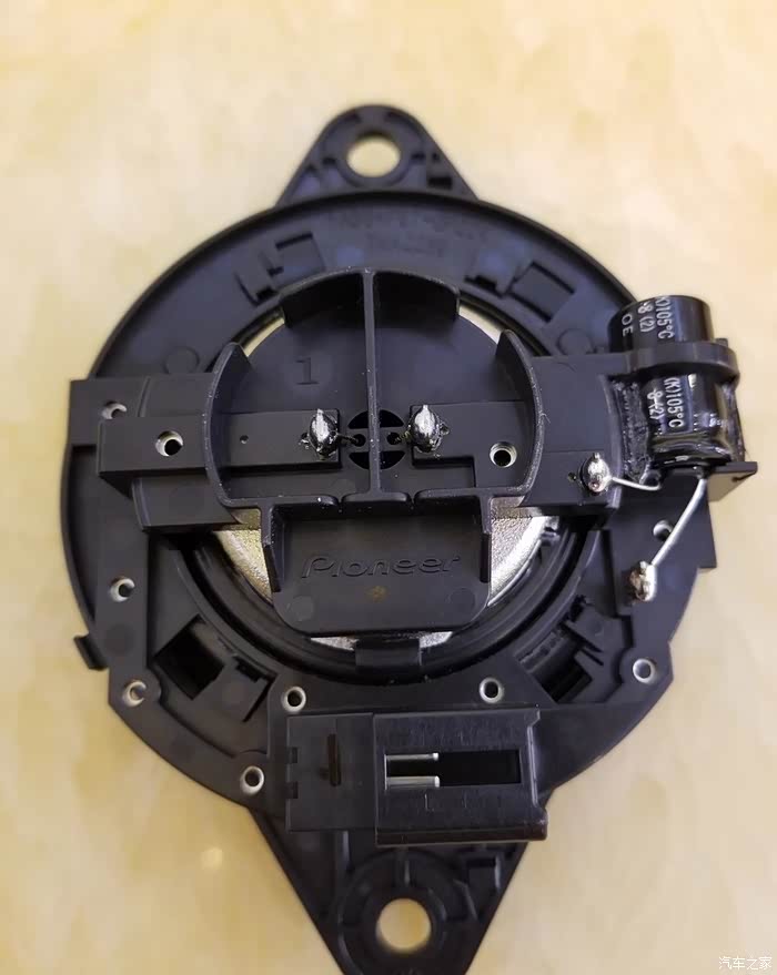 仪表台两边先锋喇叭的背面,高音通过一个分频电容来分频。