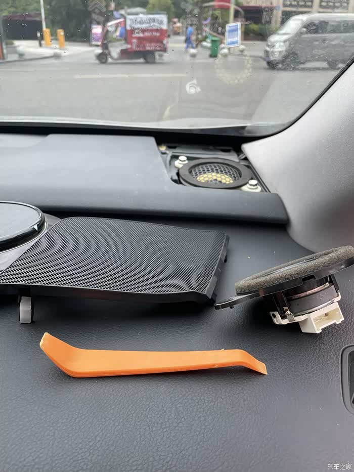 仪表台两边也一样,敲开盖板,拿出原车喇叭,把原车线与无损对插线对接,然后安装后装喇叭即可。
