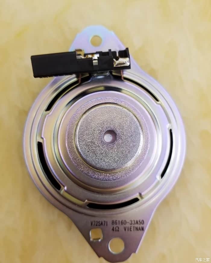 总结前门喇叭:前门6.5寸的中低音喇叭,阻抗4欧,放在一个7*9支架上面,应该是车门的结构都是一样的,所以支架为马克的支架,为了节约成本,用了6.5寸的中低音喇叭,是不是惨不忍睹。塑料支架,小的可怜的磁铁。不过几乎市面上所有车型的中音喇叭都这副德行。毕竟一分钱一分货,无可厚非。