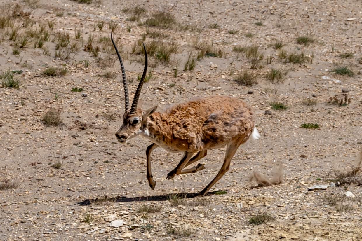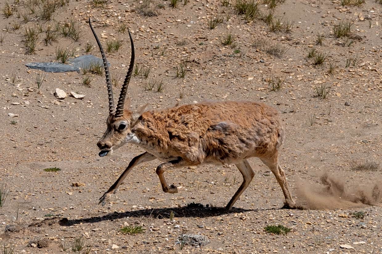 突然一头藏羚羊路过,赶紧停车,跑远了,它突然又回来了,就有了这张抓拍,还吐舌头了