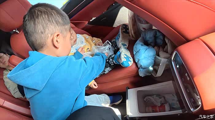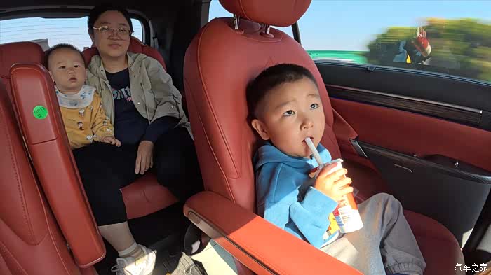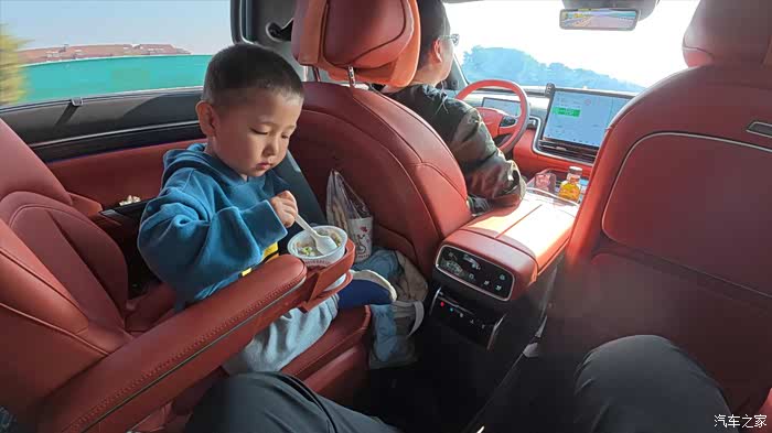 旅途中尽显eπ008的贴心设计。一上车,主驾后背的隐藏式按压挂钩稳稳挂住孩子的八宝粥;副驾驶后的航空小桌板展开,刚好放下装早餐的袋子;恰逢天气转暖,低温鲜奶放进5/50度冷暖两用小冰箱,开启制冷模式。二排扶手的弹出式杯托就是临时“小驿站”,想拿随拿触手可得。孩子爸通过副驾驶老板键,调节前排座椅前后、和靠背角度,再配合座椅电动滑轨和腿托,打造出舒适宽敞的专属空间,惬意地陪伴大崽享受旅途。我和一岁半的小崽坐在最后一排也十分宽敞,小家伙睁着好奇的大眼睛,打量着车内的一切。我陪他说说话、喂点小零食,他还时不时走向前面,找哥哥玩耍,一路上欢声笑语不断。