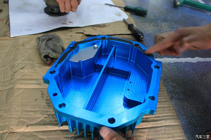 加工原厂油底壳的涡轮回油口,安装完毕!涡轮共用了原车上的发动机润滑油,从引擎室引出的机油润滑油过涡轮之后从这个口回到油底壳!