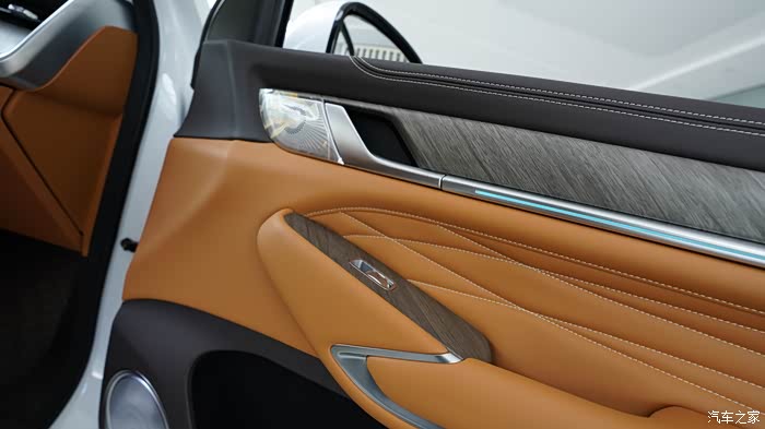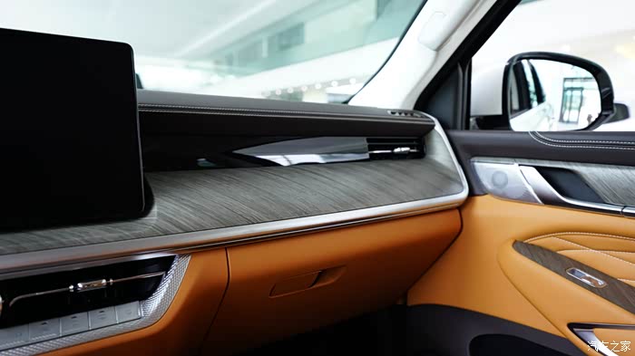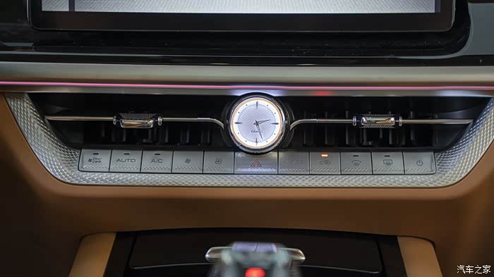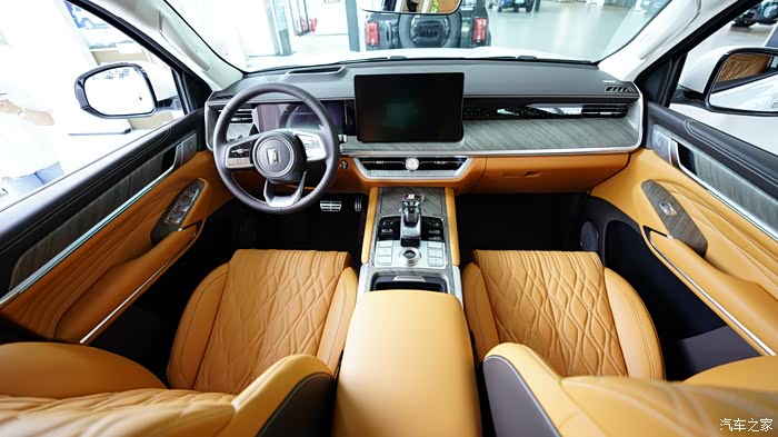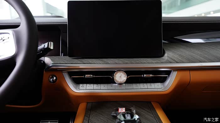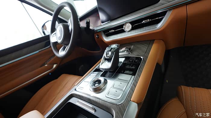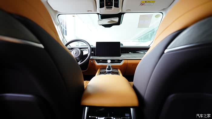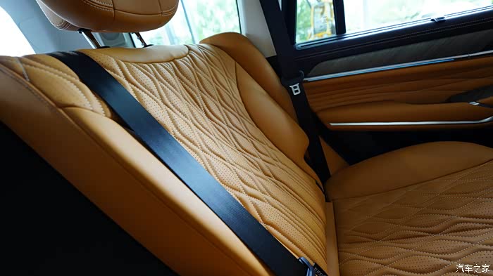 内饰配色挺活力的,说是棕色,但我看着像橘色。12.3 英寸的全液晶仪表盘、14.6 英寸的中控大屏,还有为后排乘客配备的7 英寸扶手屏,上面有座椅按摩,娱乐等触屏操作选择,无时无刻不在提醒你,坐上这台车,就是身份的尊贵, 就要享受最好的服务。