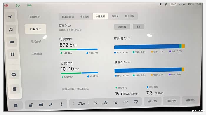 全程下来,表显平均驱动电耗19.6L/100km,平均综合油耗7.3L/100km。