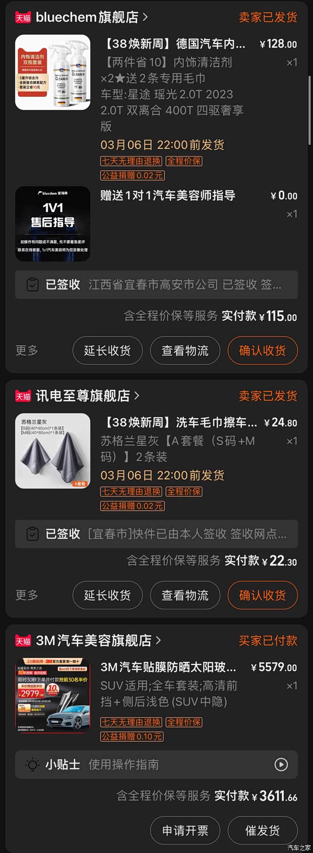 落地-置换1w=20w+,没要贴膜没要镀晶,只要了脚垫凑合用,等tb出tpe专用脚垫,因为是奢享,内饰白色,车子没提就买好了真皮清洁剂,也买了一些小配件,钥匙扣车牌框等,膜买了3m铂睿,等上牌后贴,晚上12123选了个CAG711号牌,群里车友评价还不错。