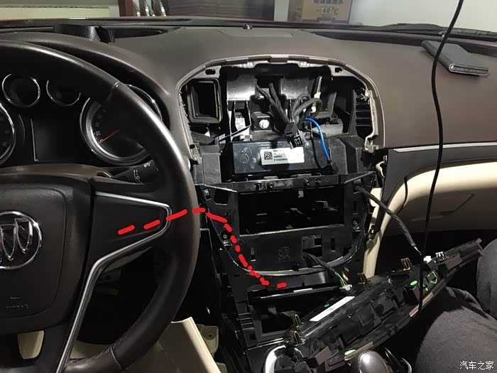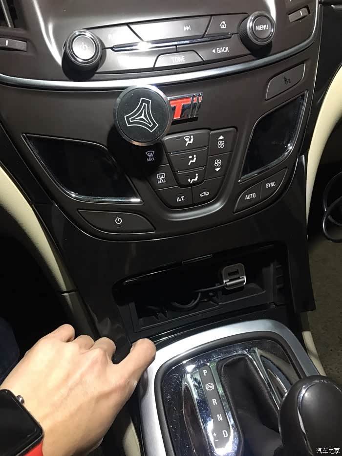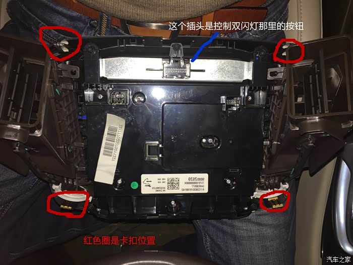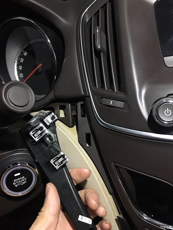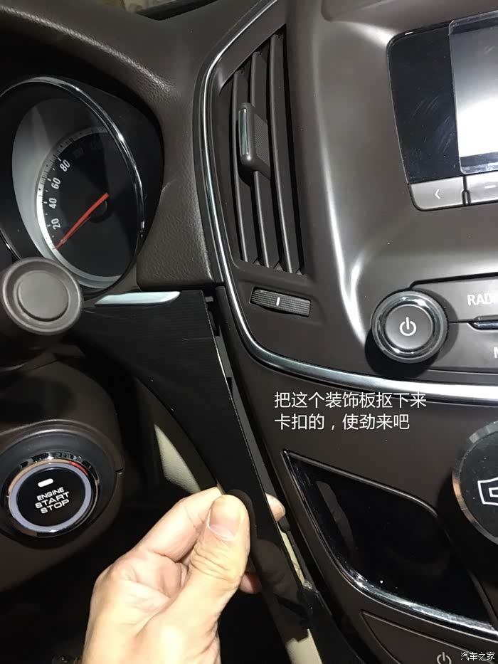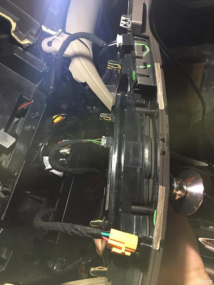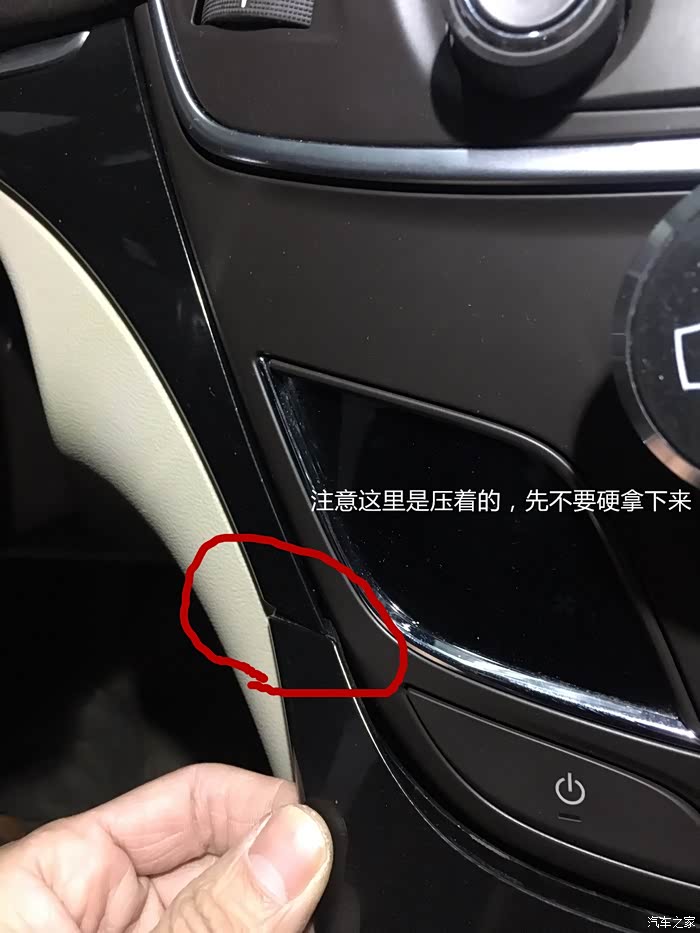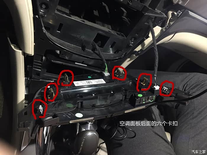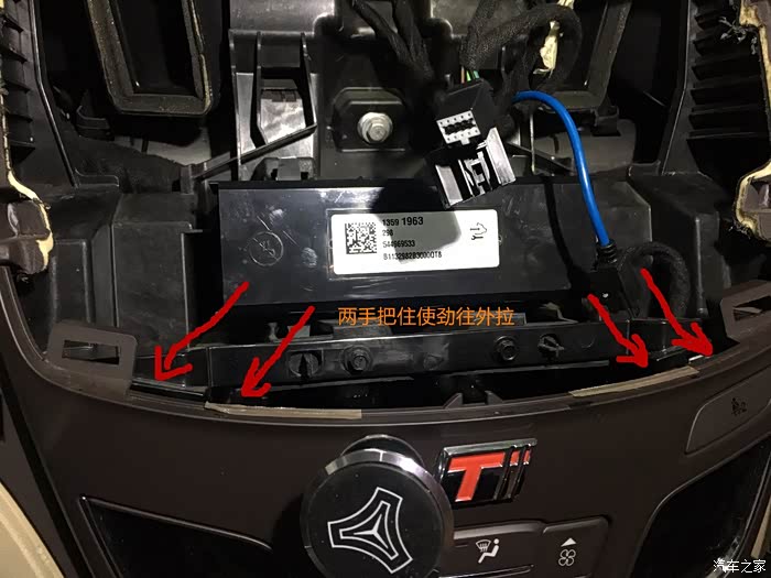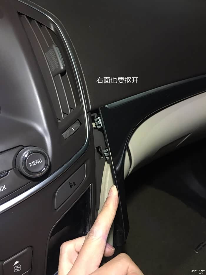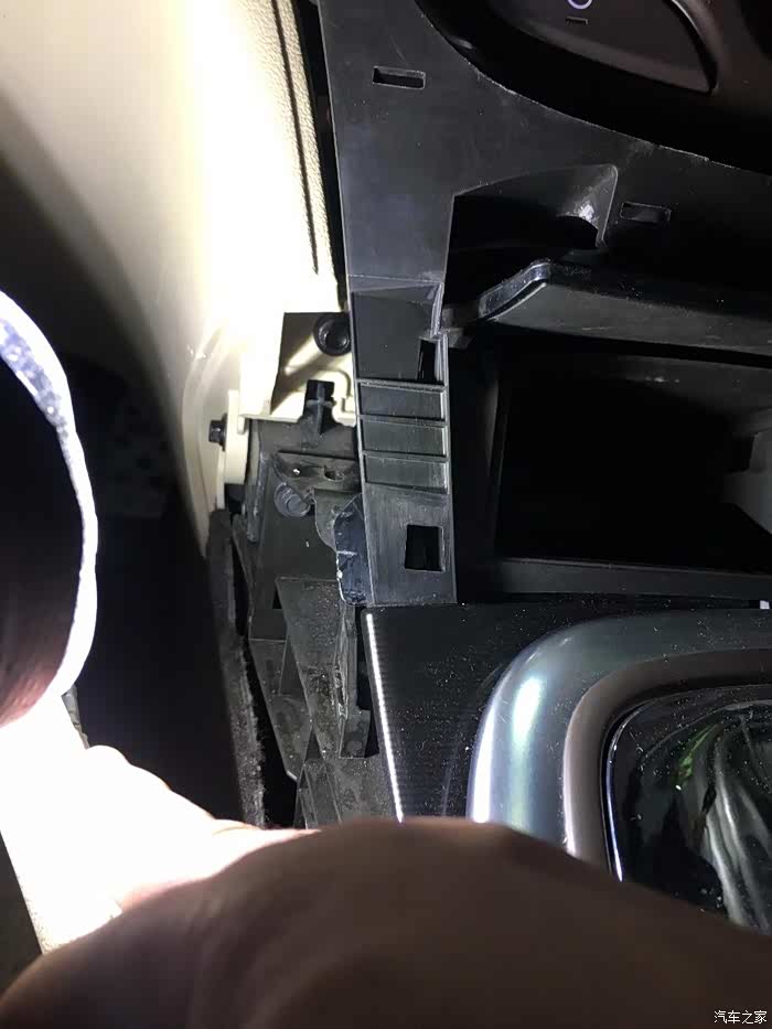 先把烟缸的卡扣拽开,先不要拿下来,我手那里及对称的右边各一个卡扣,注意这个烟缸的装饰板不用单独拿下来,整体下来就行