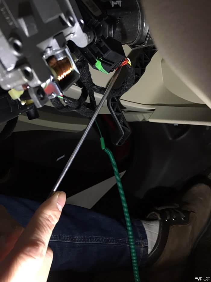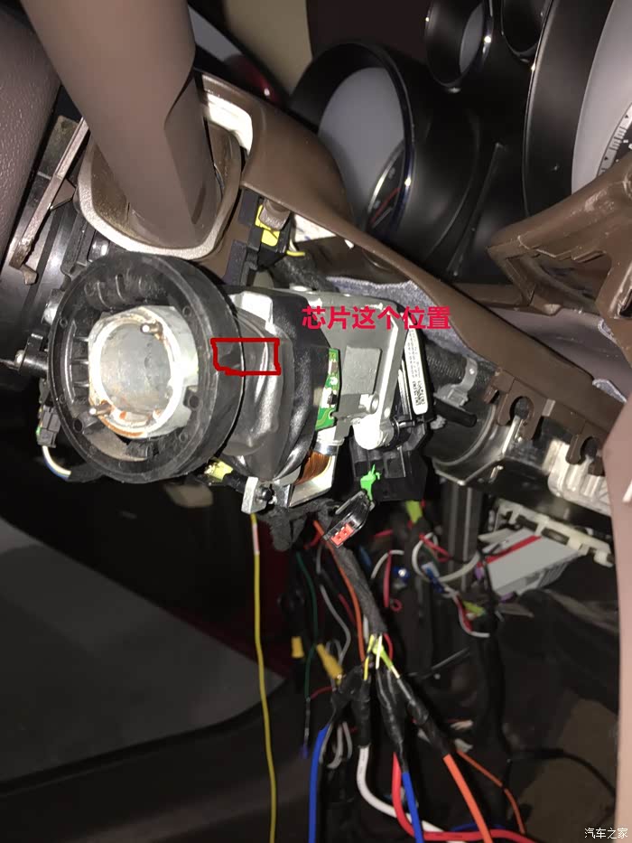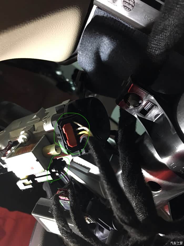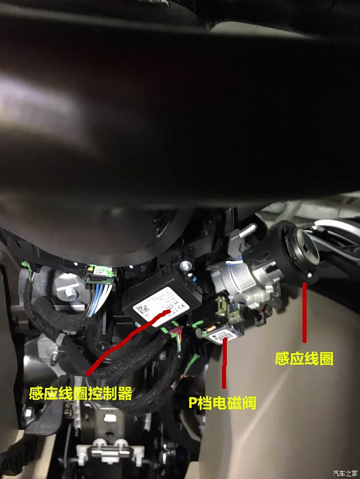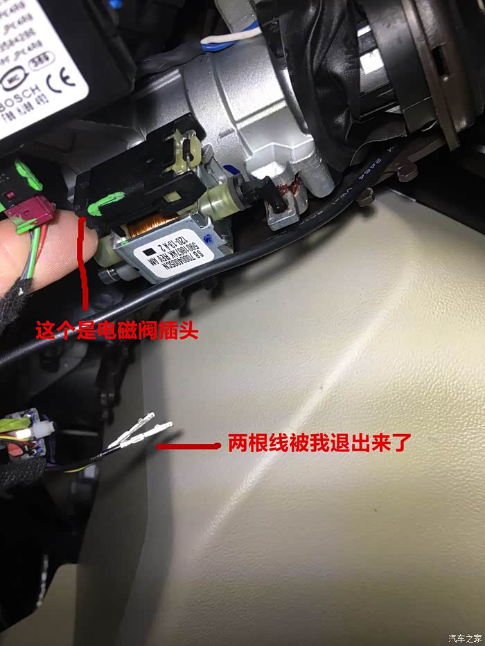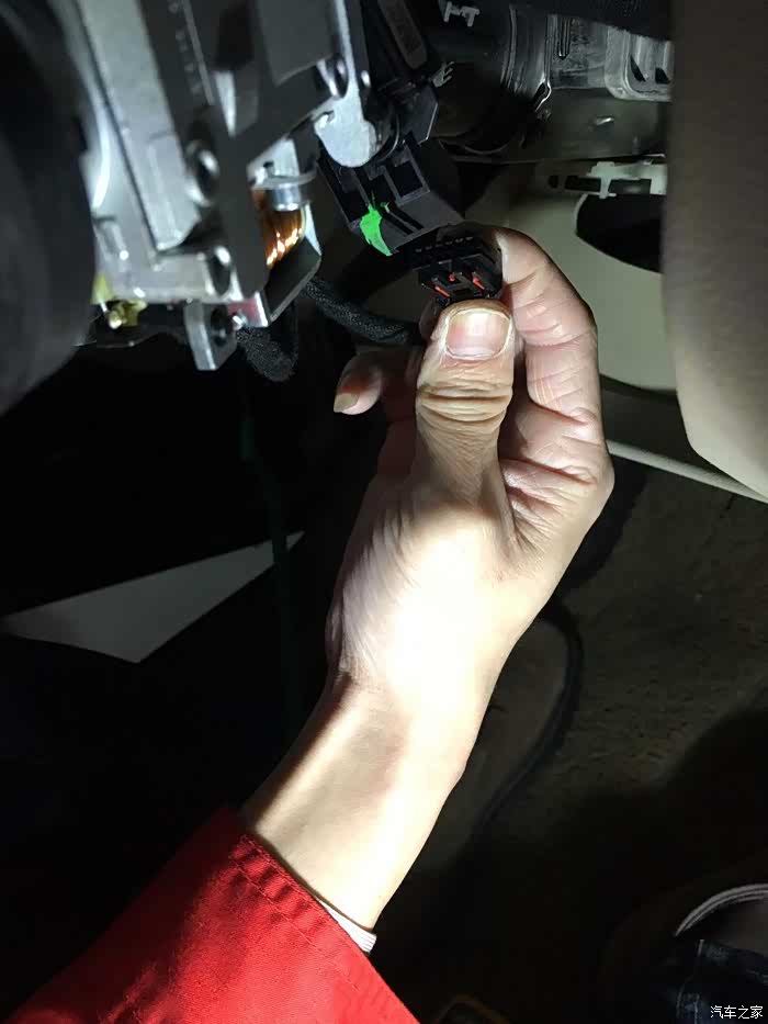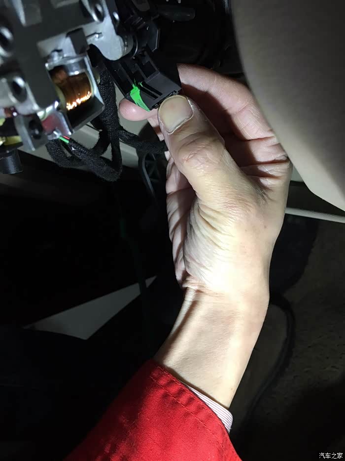 这时需要拔掉两个插头:1、P档电磁阀后面的;2、锁芯后面的点火开关插头(往下看