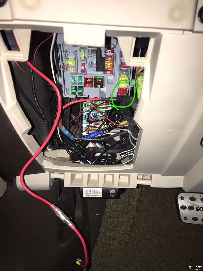 用取电器(红色线)从这里取电,25和26号位置都可以,注意取电器有方向性的,如果光插上面的保险,电线一侧的端子是需要插到有电端的,插上没有电就把取电器转一下再插进去,如果想两个方向插都可以就需要取电器上面插两个保险