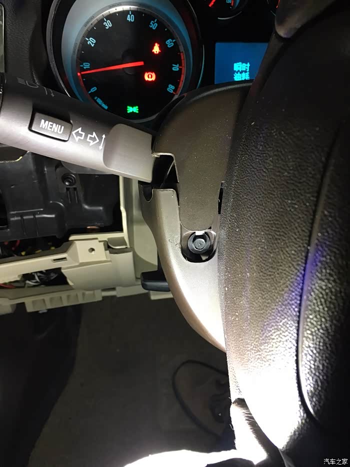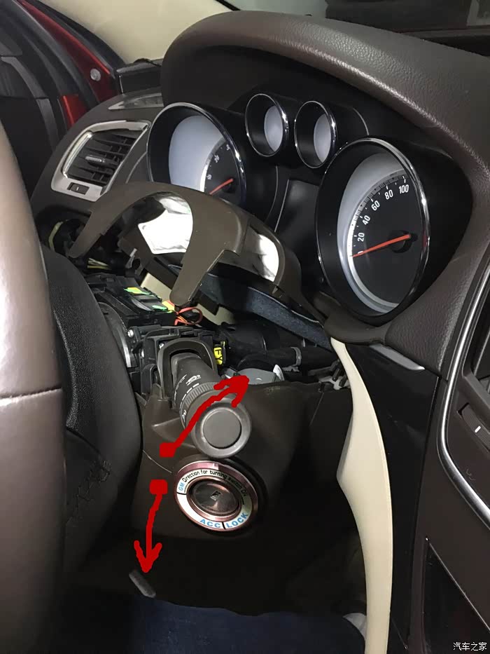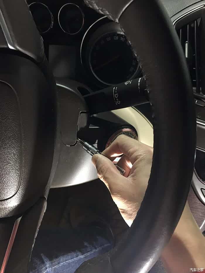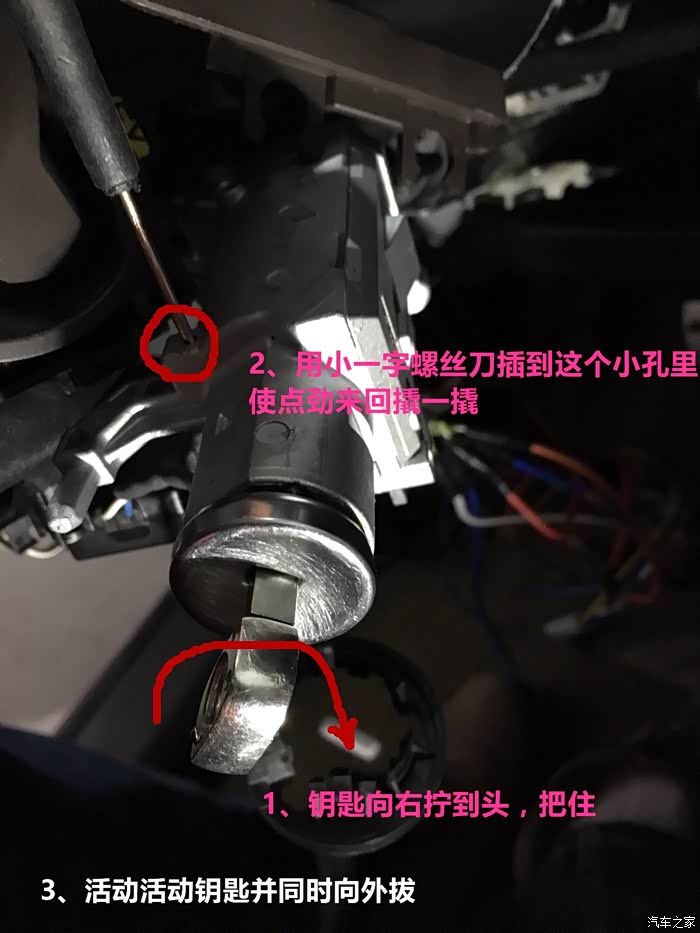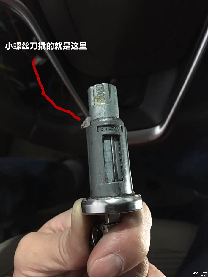 点火转动方向盘半圈看到这里,用一字螺丝刀撬开这里