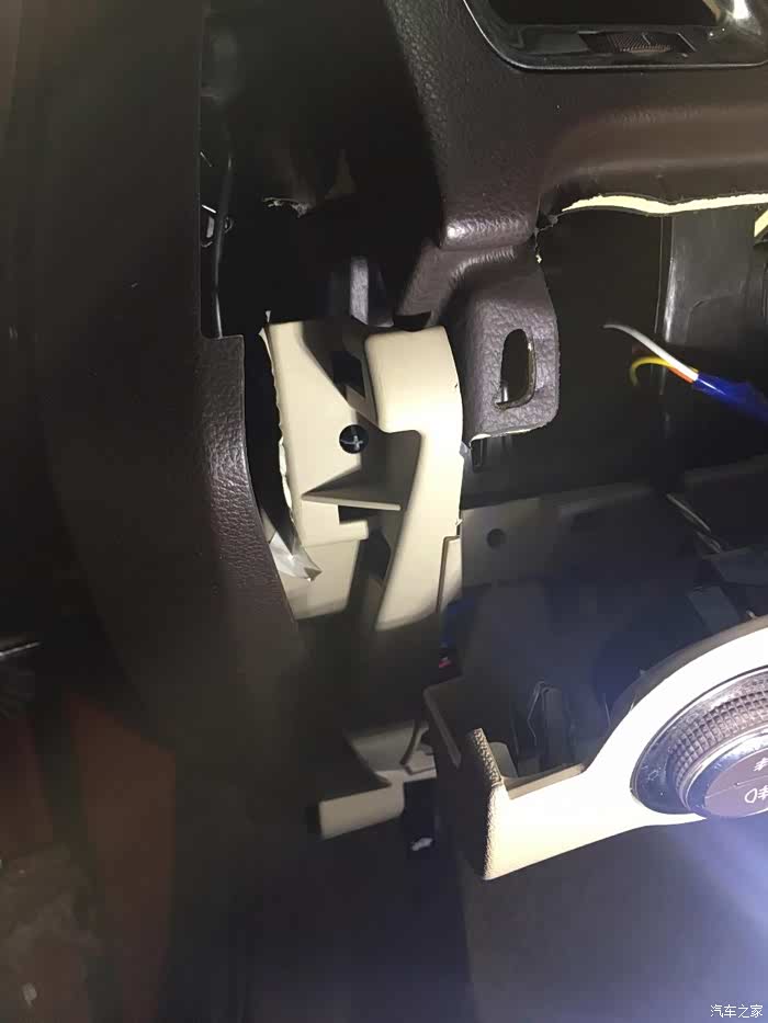 方向盘下储物盒拿掉。左右两边这个位置按住就可以拿下来了