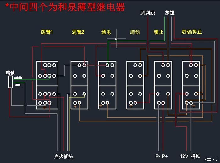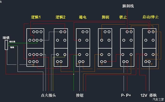 在家里先把继电器和按钮底座的线都接好,点火开关、P档电磁阀、电源、搭铁、按钮线可最后在车上穿完线再取合适长度接上
