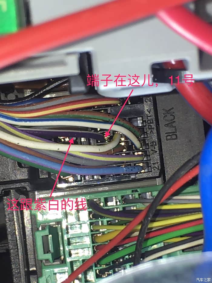 第11号线,这根线其实是高位刹车灯的供电线,最好测试一下,汽车通电后,测试最好放在所有步骤的最前面做,为了操作的连贯我把这步放在了这里,讲到这里锁芯和点火插头已经拆掉了,不过这里可以把点火开关保险插回去并把点火插头插上,不用全部插进去,不掉就行,然后马上就通电了,测试这根线是否踩着刹车会有12V的输出,并且松开刹车12V就没有了