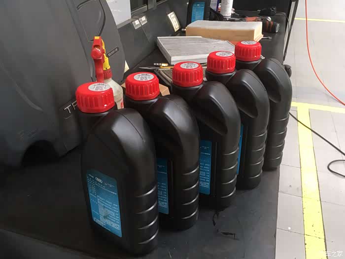 看到我保养用的机油了吗?5桶1升装的,为什么不用1桶大的加1桶小的?这里告诉大家一个秘密,大桶和小桶机油的供应商有可能不是同一个厂家。虽说都是奥迪认证的机油,混着加也问题不大,但是主人不允许我受任何委屈,所以专门挑了同一个供货商的机油,每次保养都这样,我这种强迫症挑不出任何毛病